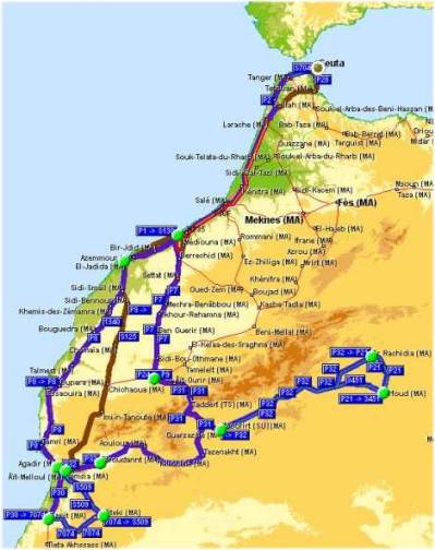 Route der 23-tägigen geführten Reise im April mit 18 Campingfahrzeugen durch “Doris Dreyer MAROKKO-Tours für