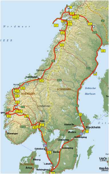 Narvik auf die Inselgruppen Vesteralen und Lofoten. An der norwegischen Westküste Richtung Süden nach Bergen und von dort nach Oslo. Über Göteborg, Kopenhagen zurück nach Egelsbach.
